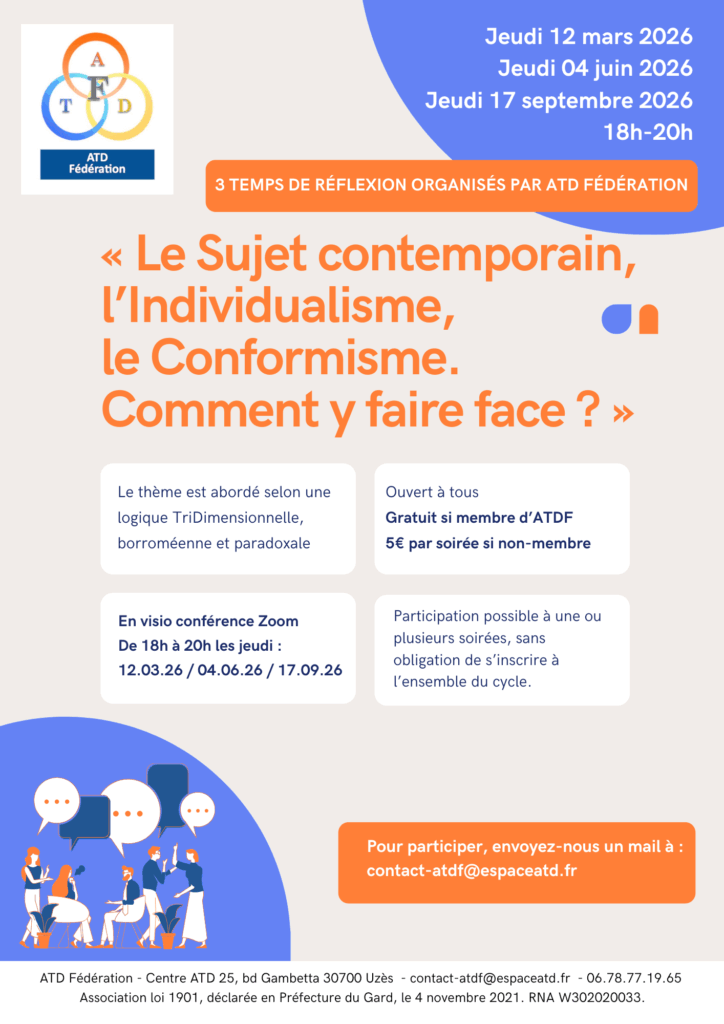 Chaque trimestre, ATD Fédération propose un temps de réflexion sur un thème choisi et travaillé sur trois temps, afin d’éveiller un regard TriDimensionnel sur des thèmes sociétaux qui peuvent nous toucher dans notre pratique.