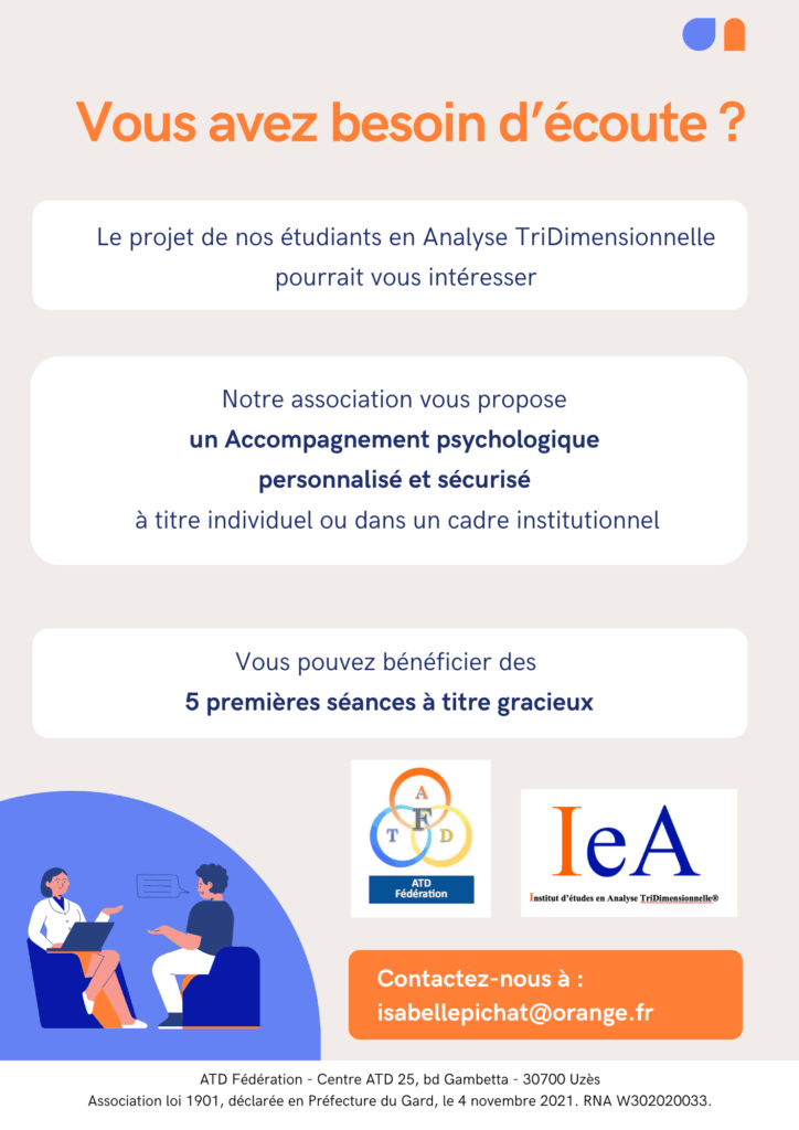 Le principe est le suivant : permettre une première expérience pour les étudiants en ATD de l’Institut d’études en Analyse TriDimensionnelle (IeA) et permettre aux personnes en rupture ou grande fragilité psychosociale de bénéficier d’une écoute dans un cadre protecteur avec des personnes formées à l’ATD et supervisées dans leur pratique par l’équipe de formateurs.